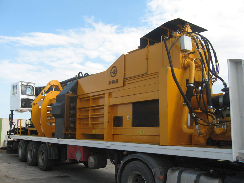 Prensa de óleo hidráulico instalado em plataforma móvel com grua para auto-alimentação.